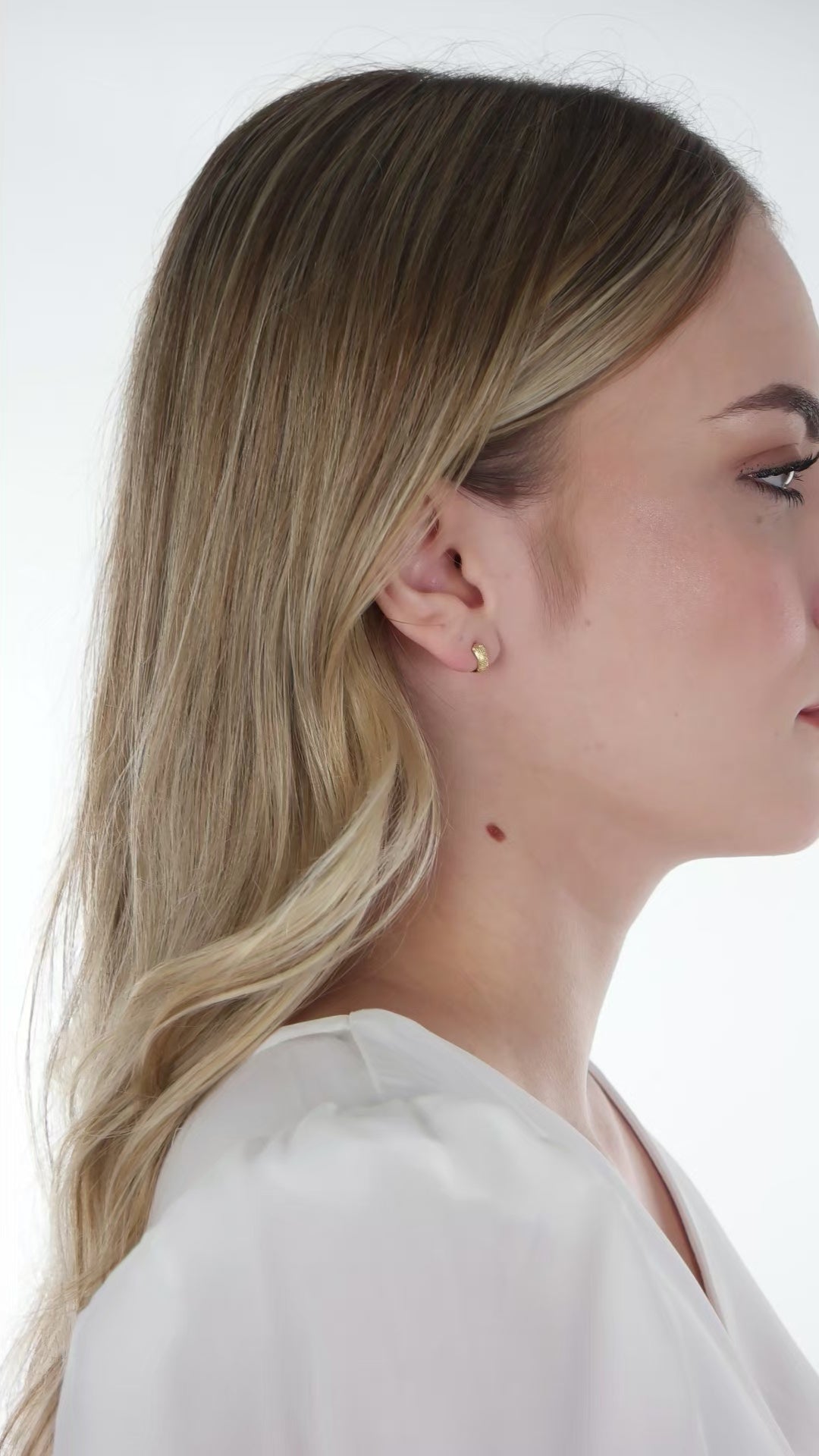 These textured mini hoop earrings blend timeless elegance with a fresh, contemporary touch. Featuring a unique dotted detail along one side, they offer just the right amount of dimension and sophistication. Lightweight and designed for all-day comfort, their secure hinge closure ensures a snug, worry-free fit. Whether styled solo or layered, these versatile gold-plated hoops are perfect for everyday wear or curating a chic boutique collection your customers will love.