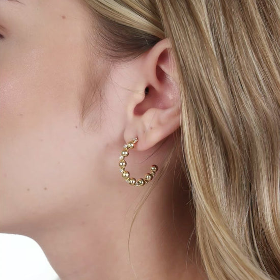 These eye-catching hoops combine textured gold-plated beads with shimmering zirconias for a fun, light-catching design your customers will love. The 18k gold-plated finish adds just the right touch of everyday glamour. Perfect for adding personality to casual looks or elevating a night-out outfit, these hoops are a versatile style.