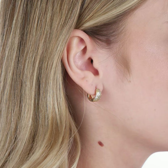 These dainty 12mm hoops feature three rows of sparkling cubic zirconias, offering a refined touch of brilliance in a sleek, minimalist silhouette. Finished in radiant 18k gold plating with a secure hinged closure, they’re perfect for all-day comfort and effortless elegance.